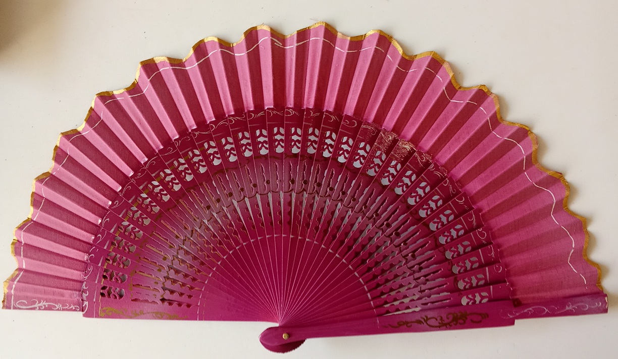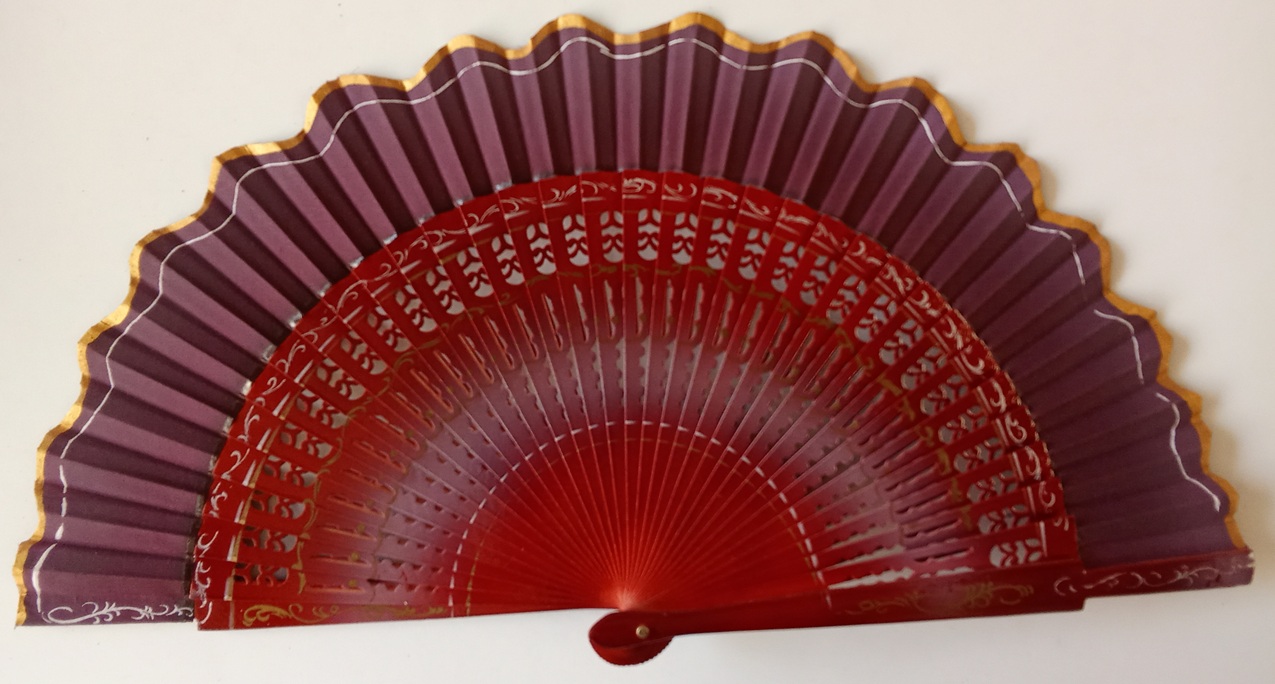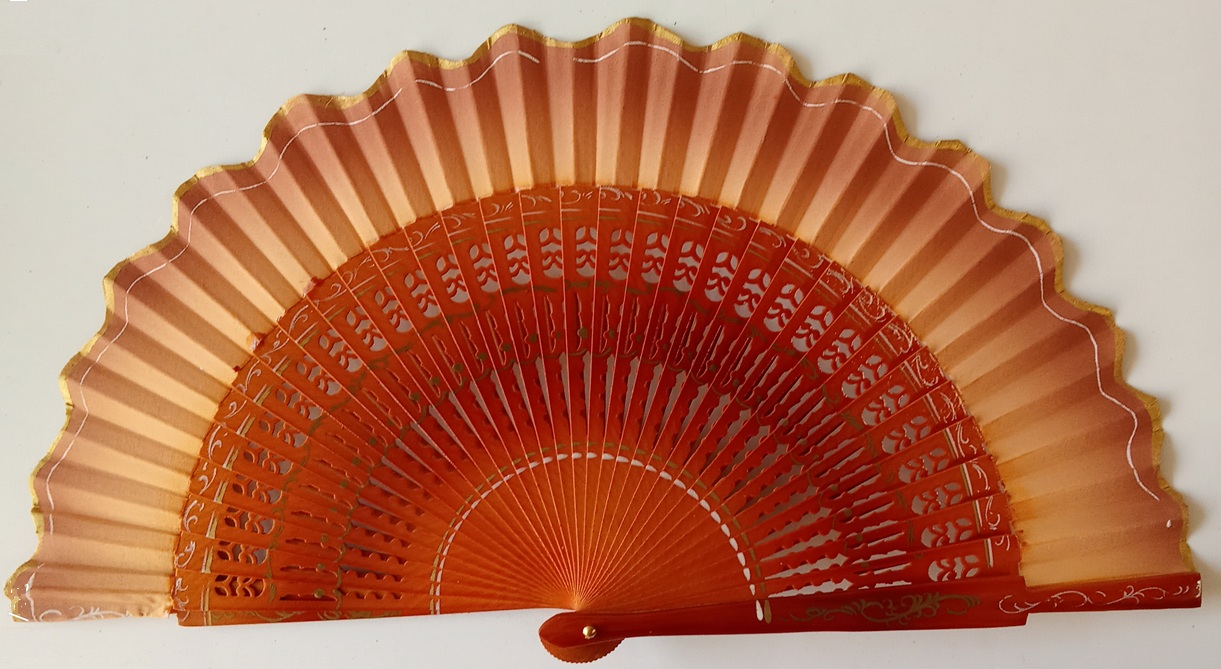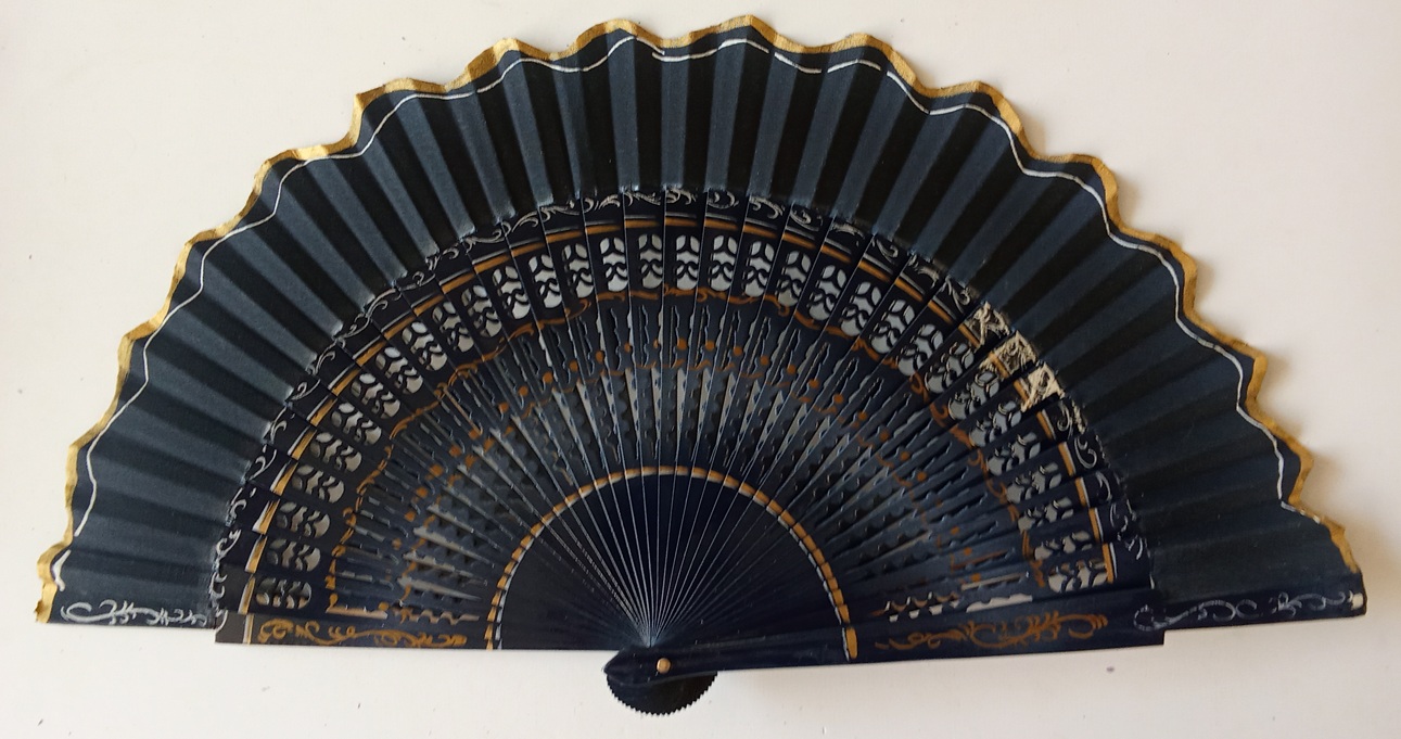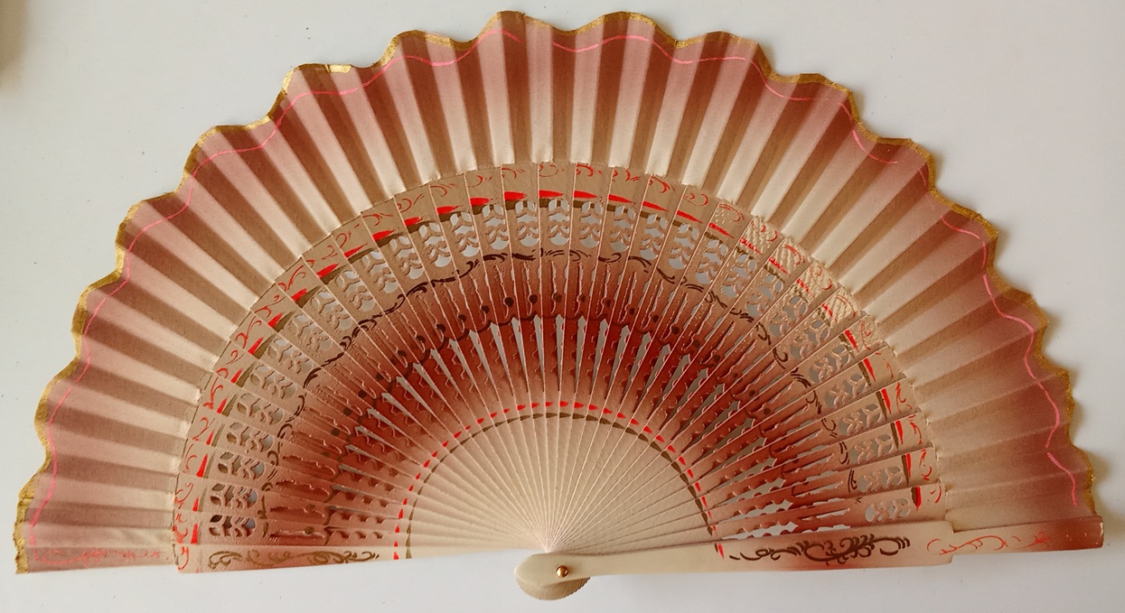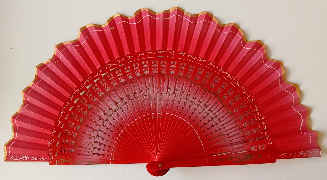 Abanico de madera, calado y lacado. Pintado a mano con bordes recortados en forma de ondas